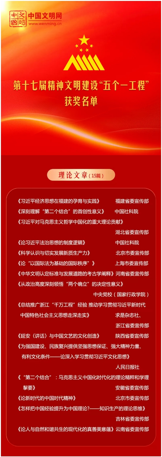 据悉,此次“五个一工程”全国共15篇理论文章获“优秀作品奖”。