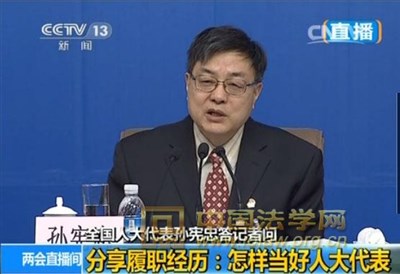孙宪忠,男,陕西省西安市长安区人,中共党员。第十二、十三届、十四届全国人大代表,第十四届全国人大常委会委员,第十三届十四届全国人大宪法和法律委员会委员,中国社会科学院学部委员,中国社科学院法学所一级研究员,中国社会科学院大学特聘教授。国务院突出贡献专家津贴获得者。最高人民法院法官遴选委员会委员、特约监督员;最高人民检察院检察官遴选委员会委员、特邀监督员、专家咨询委员。中国法学会常务理事、学术委员会委员,中国民法学会常务副会长。中国社会科学院民法典课题组首席研究员。担任全国人大代表期间,向我国最高立法机关提出编纂民法典的议案、建议、立法报告七十余份,其他议案、建议、立法报告和审议发言上百份,其中启动民法典编纂的议案、民法典编纂规划分为两步走的议案、民法总则编纂方案的议案、关于特别法人、民事权利、物权法制度、合同效力等立法建议为立法采用。此外,出版独立专著以及合著30余部,发表论文100余篇、理论文章140余篇,在德国、日本、韩国及我国台湾地区发表论文10余篇。1999年被中国法学会评为第二届“中国杰出中青年法学家”。中国民法学科得到国际认可的法学家。