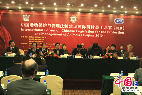 与会的国内外代表围绕反虐待动物的背景和目的、反虐待动物的基础理论、反虐待动物的体系、反虐待动物的执法和司法、野生动物的反虐待法制建设、实验动物的反虐待法制建设、农场动物的反虐待法制建设、宠物动物的反虐待法制建设、动物医疗的反虐待法制建设、动物运输的反虐待法制建设、动物屠宰的反虐待法制建设等角度,对《反虐待动物法》(专家建议稿)进行了充分的研讨。与会者一致认为,单纯的道德谴责解决不了中国一再发生的动物虐待事件,需要一部反虐待动物或善待动物的法律,但作为一个发展中国家,中国的动物保护法制建设的发展有一个过程。在这一过程之中,我们应借鉴国外成熟的动物保护立法经验,发展和完善既符合中国国情与文化传统,又促进经济和社会全面发展的反虐待动物法律。