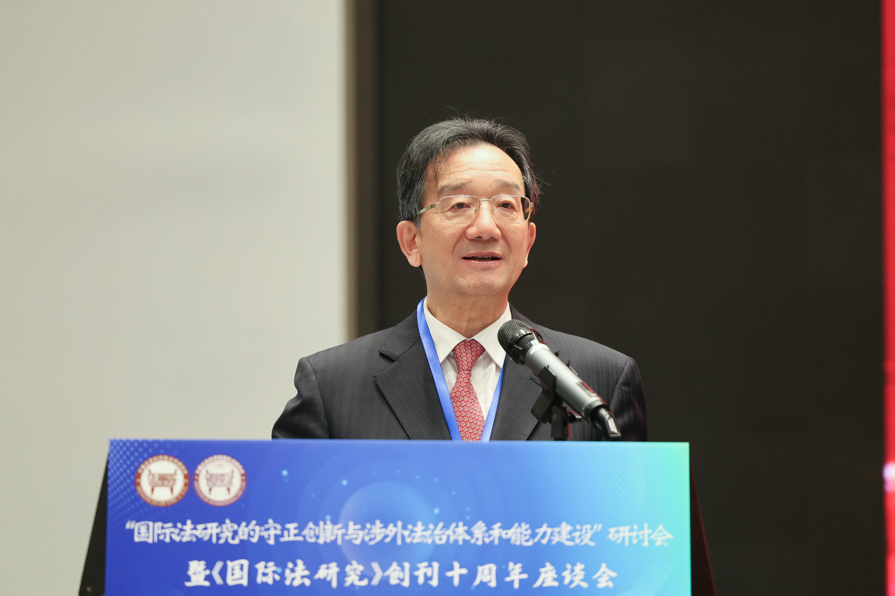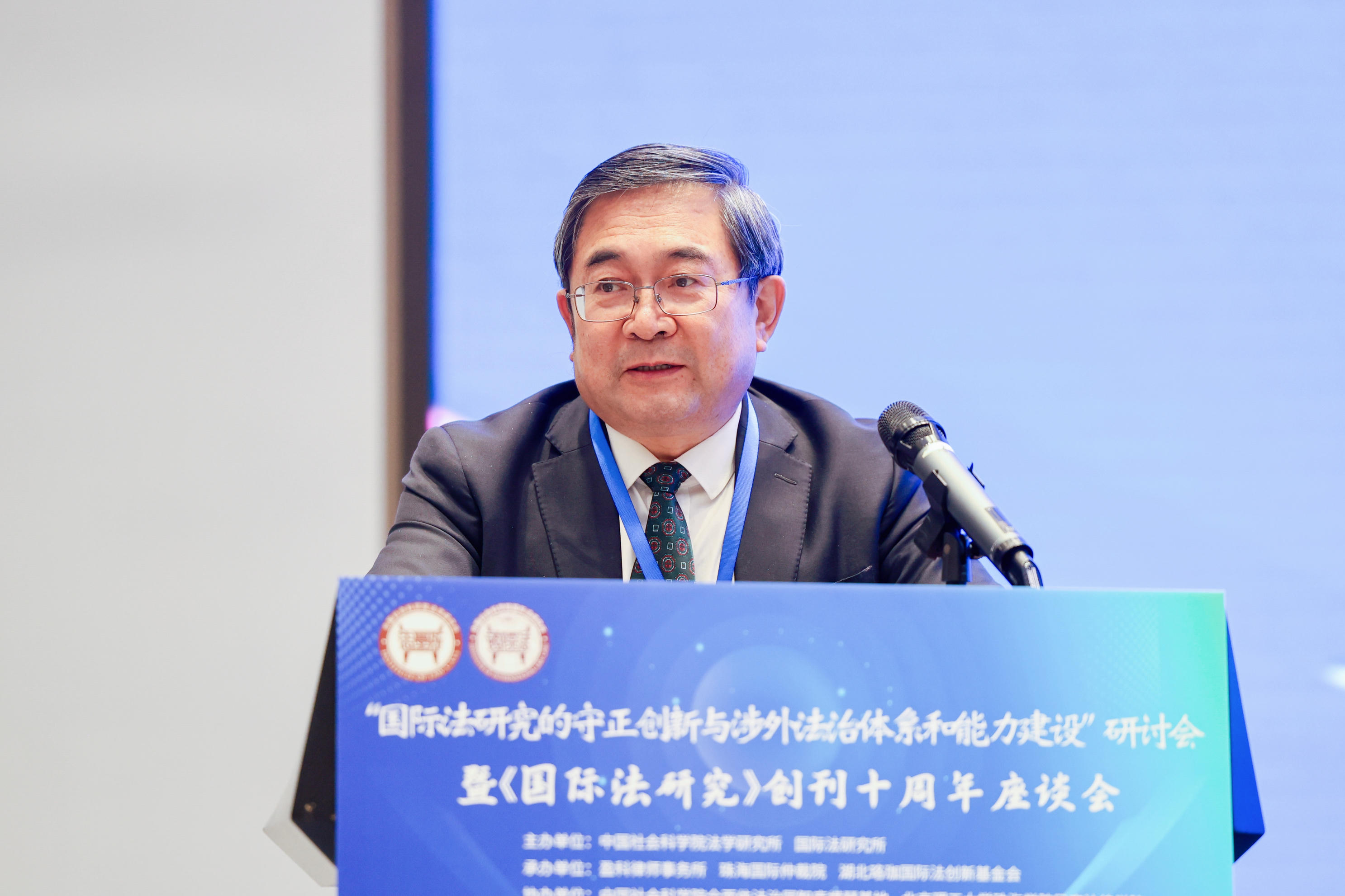 中国法学会副会长、中国国际法学会会长、武汉大学人文社会科学资深教授黄进代表中国国际法学会对《国际法研究》创刊十周年表示热烈祝贺。他指出,在过去的十年里,《国际法研究》始终坚持以深入研究国际法理论和实践为己任,精准及时地反映国内外国际法学发展的最新动态和重要成果,为党和国家工作大局提供了有力的理论支撑和智力支持,更为国际法学界提供了宝贵的学术交流平台。展望未来,他希望《国际法研究》继续秉承其办刊宗旨,紧跟国际法理论和实践发展的前沿动态,加强与国际法学界的深入交流与广泛合作,不懈推动国际法理论和实践研究的深入发展。