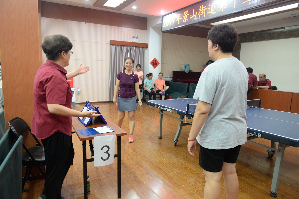 比赛在景山街道社区服务中心四层举行,参赛选手来自东城区景山街道全辖区范围内的社区单位和社区居民。比赛设男子组和女子组两个组别,不设团体赛,第一阶段为小组循环赛,第二阶段为淘汰附加赛,执行国家体育总局最新审定的《乒乓球竞赛规则》,社区服务中心选派了经验丰富的国家级裁判担任裁判长、裁判员。