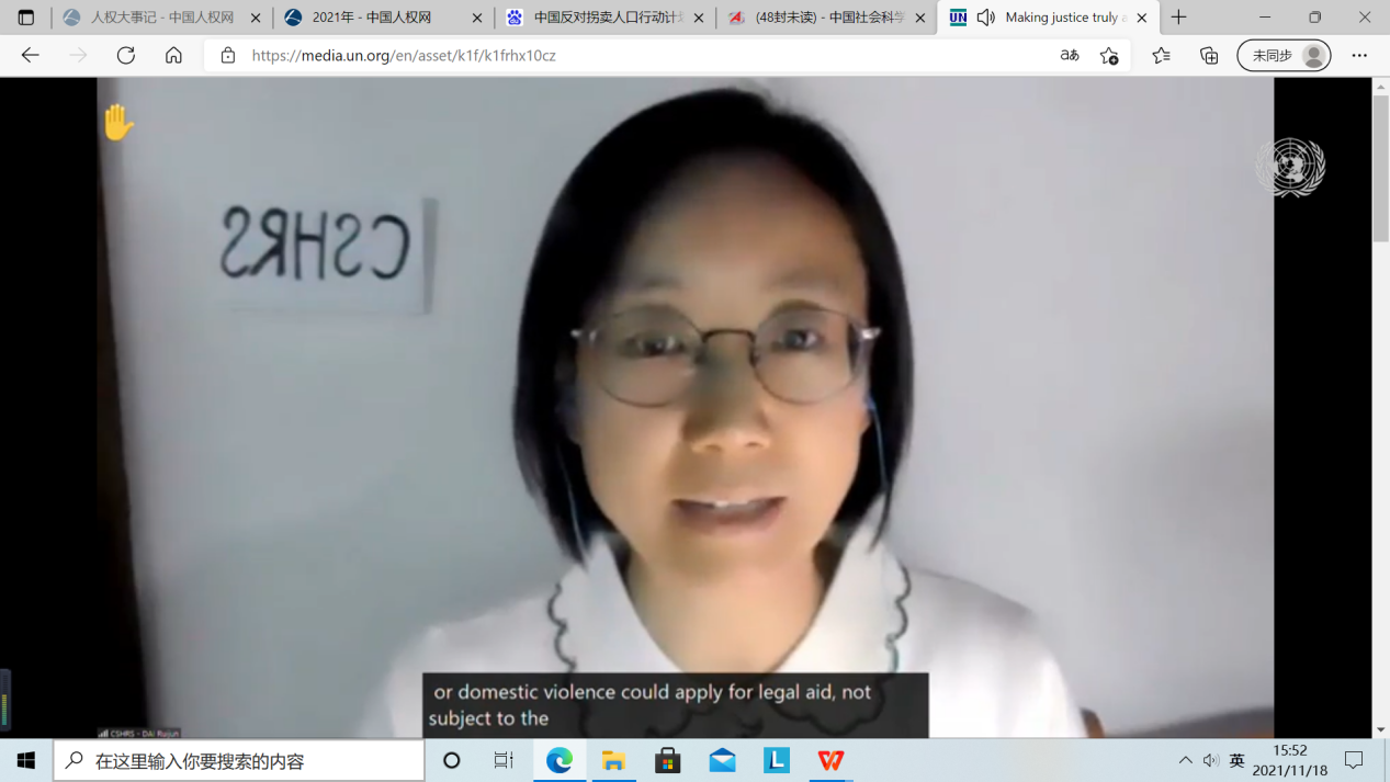 11月16日,戴瑞君研究员代表中国人权研究会发言。她强调了法律援助制度对保障所有人真正享有诉讼权利的重要意义,当事人的诉讼权利不应因性别、民族、语言或任何身份而有所区分,也不应因贫困等经济原因而落空。她还通过实例,说明法律援助如何在涉家庭暴力案件中帮助当事人获得公正的审判结果,与国际社会分享中国在这方面的良好做法。