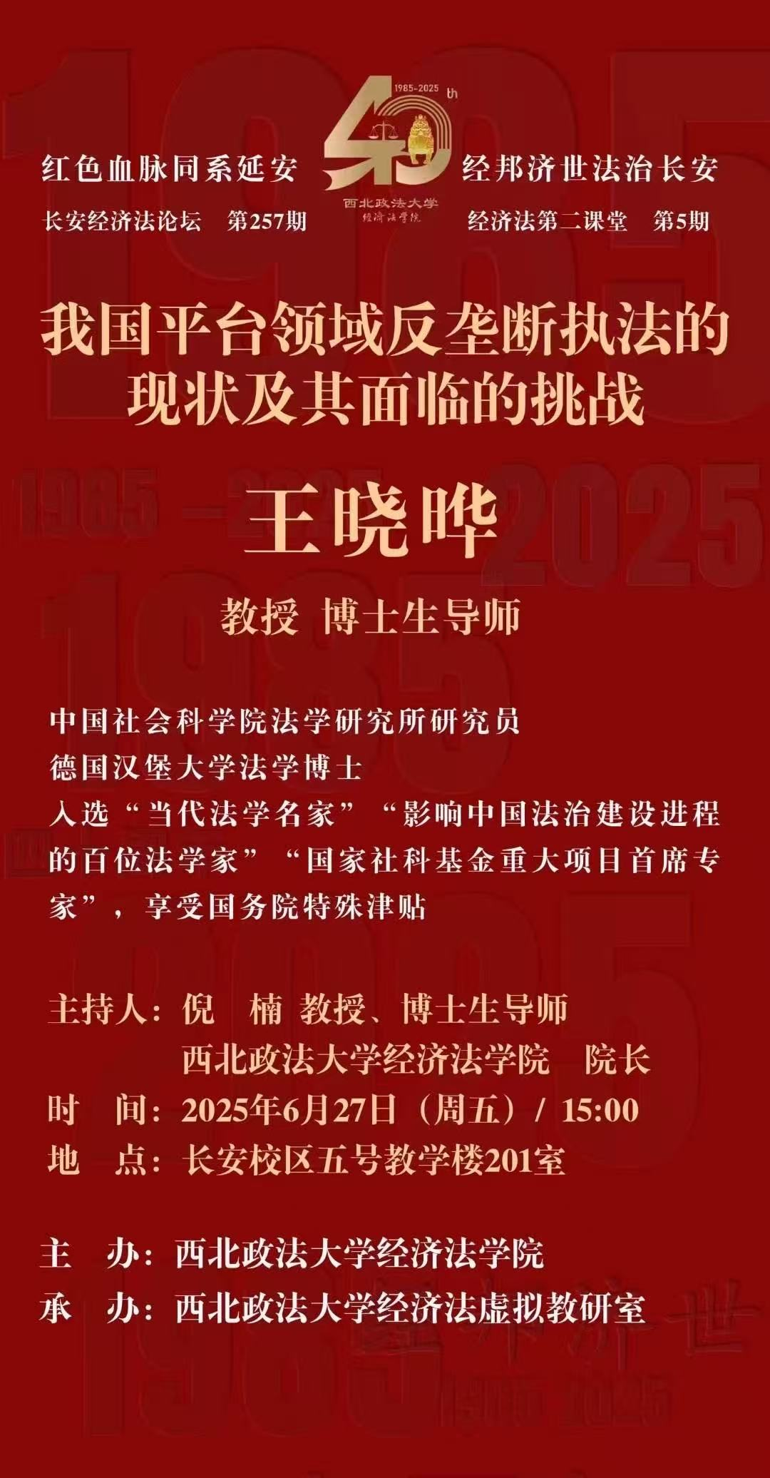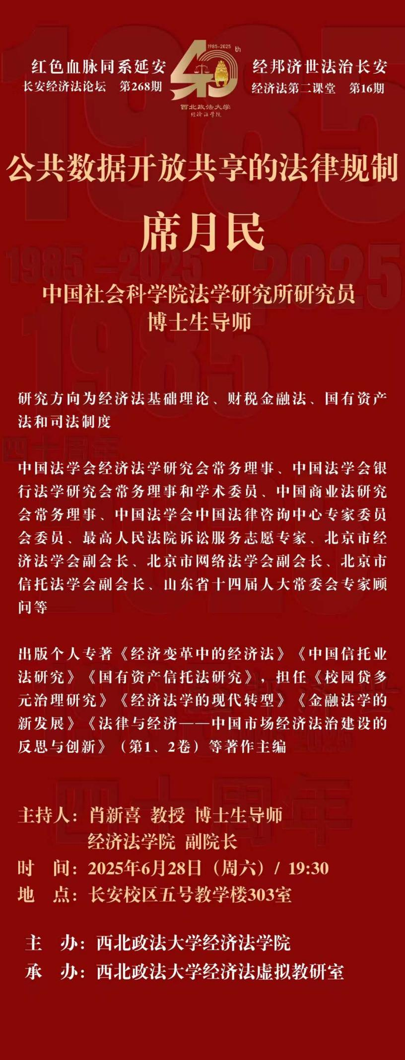 作为建院40周年系列纪念活动之一,王晓晔研究员与席月民研究员做客长安经济法论坛和经济法第二课堂,应邀给西北政法大学经济法学院师生分别作了专场学术讲座。王晓晔研究员的讲座被安排在6月27日下午,由学院院长倪楠教授主持,讲座题目是《我国平台领域反垄断执法的现状及其面临的挑战》。席月民研究员的讲座则被安排在6月28日晚上,讲座由学院副院长肖新喜教授主持,题目是《公共数据开放共享的法律规制》。席月民研究员围绕公共数据开放共享的国家政策依据、实践发展成果及存在问题、地方立法状况、统一立法建议等问题进行了深入浅出的讲解,并就现场同学的提问进行了多轮互动。倪楠院长和肖新喜副院长分别对两场讲座给予了高度评价,对两位老师在百忙中莅临该校讲学表示了由衷感谢。